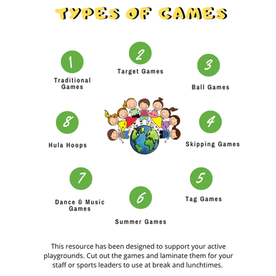 Keep playtimes active and fun with this easy-to-use pack for playground leaders and midday supervisors. Includes 8 types of engaging games—from traditional and ball games to skipping, tag, dance, and more. Simply cut out, laminate, and use to support structured, inclusive, and energetic breaktimes. Perfect for boosting activity levels and encouraging teamwork on the playground!